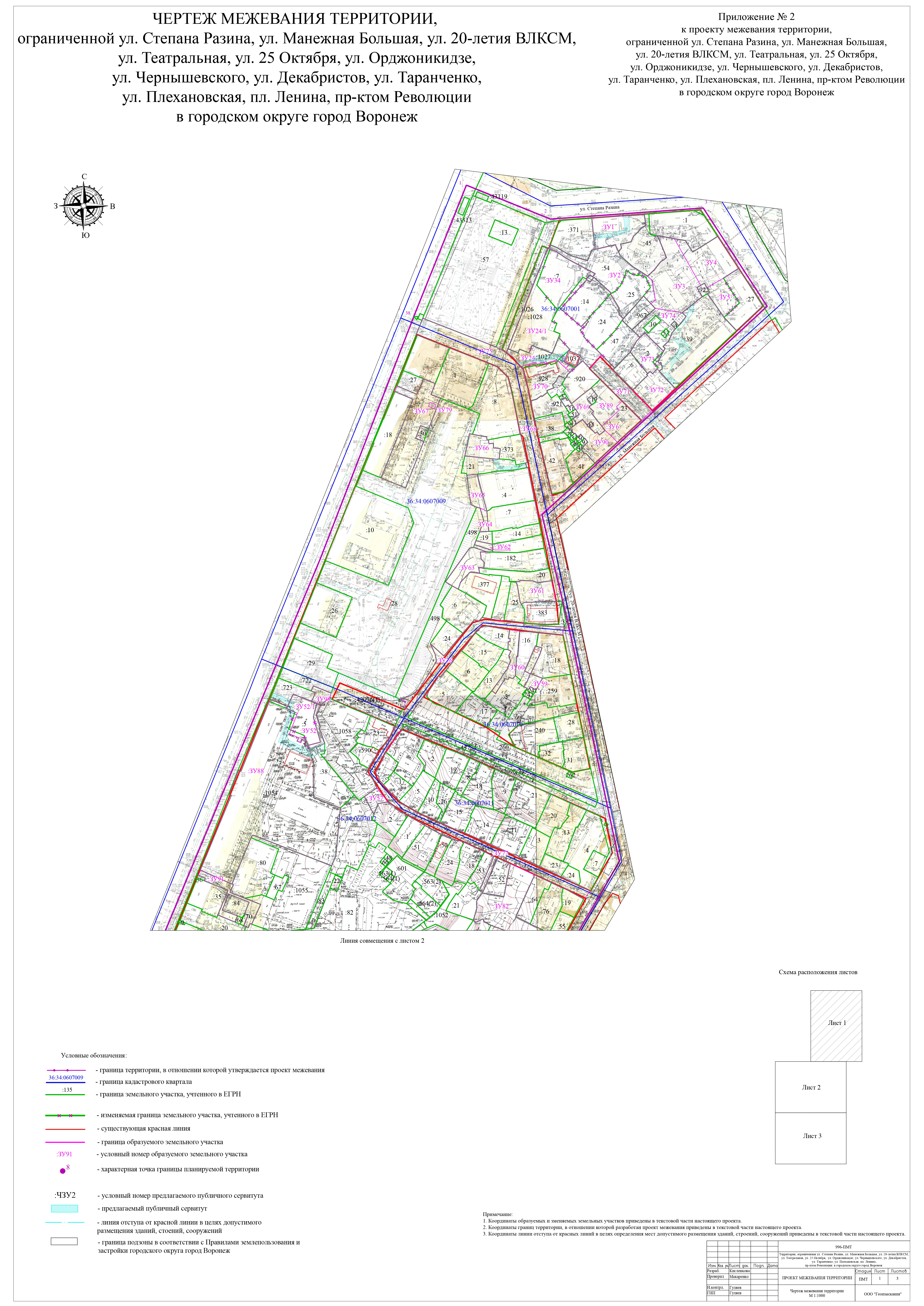 Чертеж межевания территории, ограниченной ул. Степана Разина, ул. Манежная Большая, ул. 20-летия ВЛКСМ, ул. Театральная, ул. 25 Октября, ул. Орджоникидзе, ул. Чернышевского, ул. Декабристов, ул. Таранченко, ул. Плехановская, пл. Ленина, пр-ктом Революции в городском округе город Воронеж (лист 2)