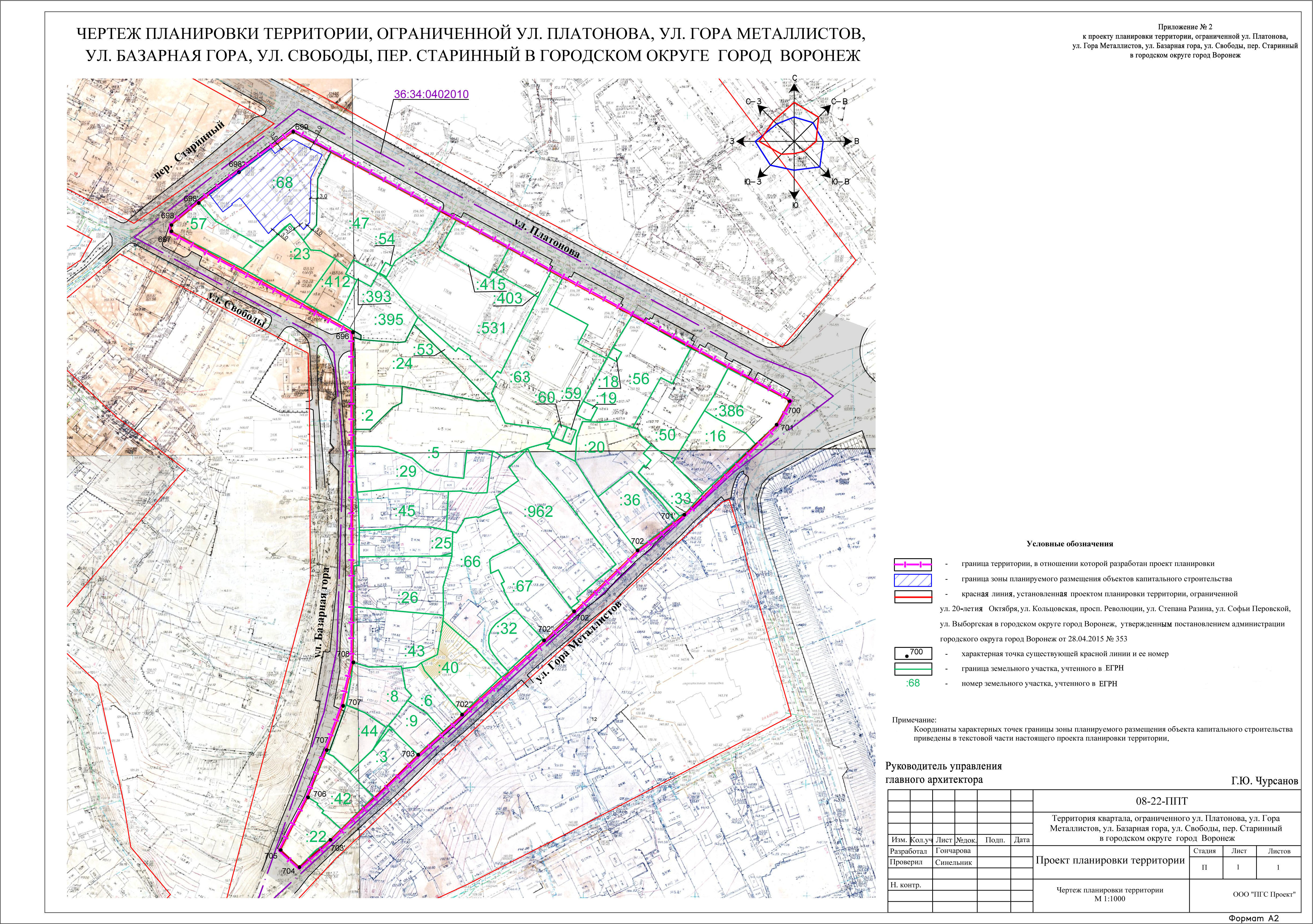Чертеж планировки территории, ограниченной ул. Платонова, ул. Гора Металлистов, ул. Базарная гора, ул. Свободы, пер. Старинный в городском округе город Воронеж