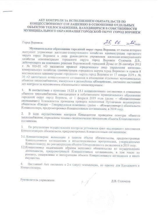 - Акт контроля за исполнением обязательств по концессионному соглашению в отношении отдельных объектов теплоснабжения, находящихся в собственности муниципального образования городской округ город Воронеж