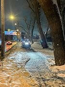 Вновь осадки с разной степенью интенсивности начались около 4 утра, в разных районах города к началу часа пик выпало от 3 до 5 сантиметров снега. В связи с этим комбинаты снова сосредоточились на ключевой задаче - не допустить образования наката и льда, провели циклы обработки песко-соляной смесью. В результате на дорогах образовалась шуга - результат работы противогололедных материалов.