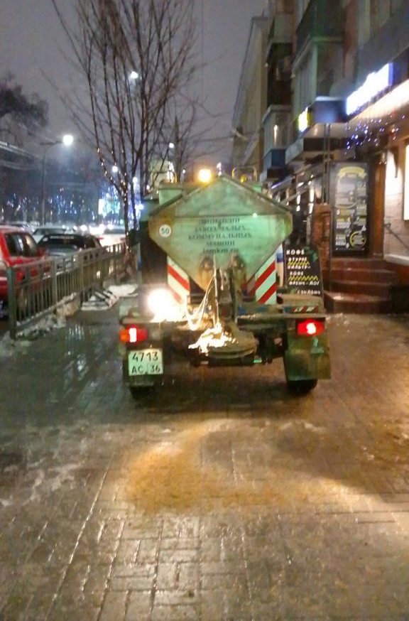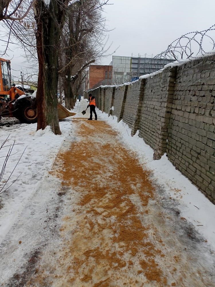 Для отсыпки проезжей части и тротуаров используется песко-соляная смесь, которая готовится из технической соли и карьерного песка. Соль вступает в реакцию со льдом и снегом, вызывая таяние даже при морозной погоде, а карьерный песок повышает коэффициент трения между покрышками автомобиля и дорожным полотном. Своевременное применение противогололедных реагентов уменьшает аварийную опасность на дорогах и травмоопасность на тротуарах. Прежде всего, специалисты обрабатывают места повышенной опасности.