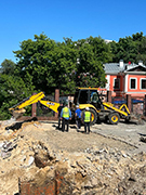 - Ночью завершили первоочередные мероприятия по демонтажу аварийной части подпорной стены Каменного моста. Сегодня планируем продолжать поверхностный разбор без заглубления в грунт. Поскольку производство работ затруднено наличием газопровода и водопровода, принято решение об установке запорной арматуры на отводе газопровода к многоквартирному дому. В настоящее время запросили проект возведения подпорной стены у компании-проектировщика. В максимально короткие сроки после его получения начнём инструментальное обследование всех конструкций: подпорных стен с обеих сторон, самого моста. Также планируем проведение инженерно-геодезических изысканий состояния грунтов, — рассказал директор ООО «Фирма ВиС» Александр Работкин.Разбор необходимого объёма плиточного покрытия с территории смотровой площадки у подпорной стены Каменного моста завершен. Теперь присоединилась техника. Она поможет проведению ручных работ, которые специалисты называют «отрывкой шурфа».