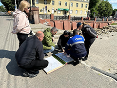 На месте работ у Каменного моста со специалистами газовой службы и главой управы Центрального района Инной Шеиной, руководителем управления главного архитектора города Григорием Чурсановым работает руководитель регионального управления по охране объектов культурного наследия Никита Гарашкин.