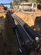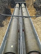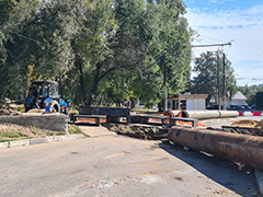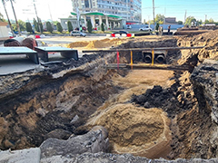 На участке магистрали в районе пересечения с улицей Хользунова ведутся работы на теплосетях – устраивается песчаное основание, монтируются железобетонные лотки теплотрасс, прокладываются новые трубопроводы.