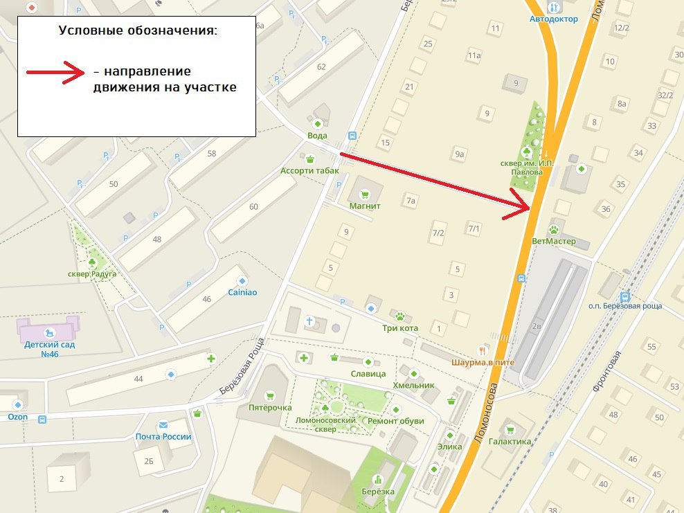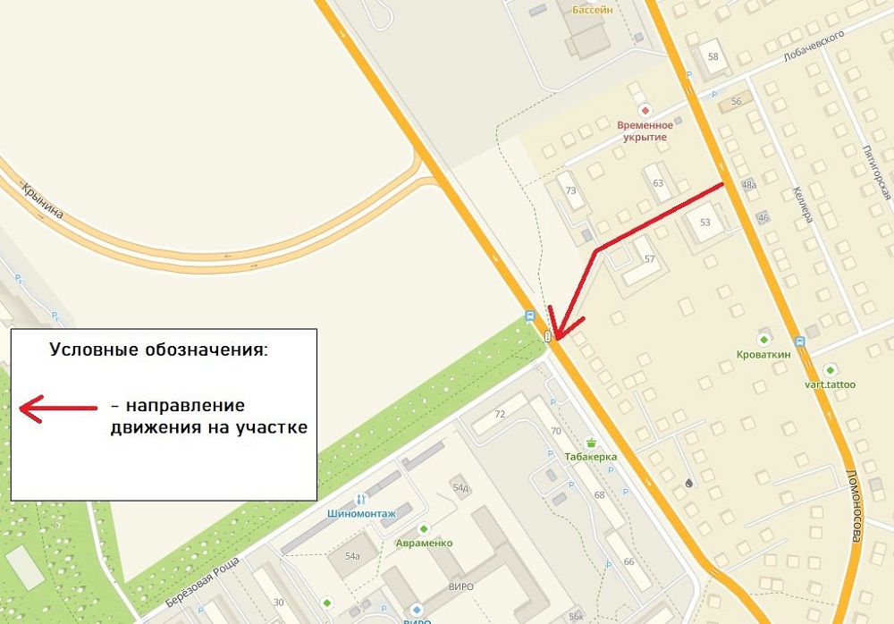 - - будет введено одностороннее движение на проезде, связывающем улицы Ломоносова и Березовая Роща – мимо домов № 53 и № 57 по улице Ломоносова. Автомобильный поток будет направлен от улицы Ломоносова к улице Березовая Роща. Это обеспечит дополнительную возможность для разворота, а также прямой проезд на улицу Березовая Роща;