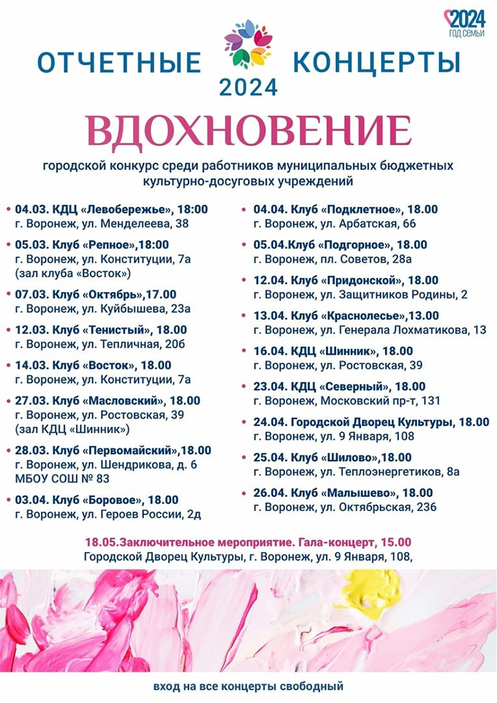 - – организация отчетных мероприятий (март-апрель). Их программа включает в себя выставку и концерт, которые организуются по итогам работы клубных формирований самодеятельного народного, декоративно-прикладного творчества, изобразительного искусства, моделирования, фотографии, кройки и шитья культурно-досуговых учреждений и отражают достижения в течение 2023 – 2024 гг.