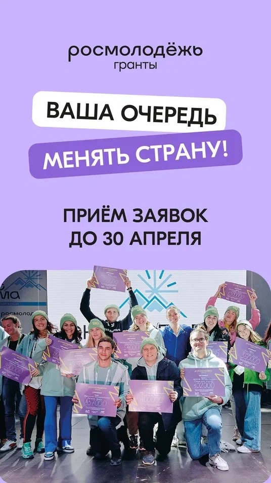 Федеральное агентство по делам молодёжи объявило о начале приёма заявок на конкурс Росмолодёжь. Гранты 1 сезон. Принять участие могут граждане Российской Федерации от 14 до 35 лет включительно. Заявить свой проект необходимо до 12:00 (мск) 30 апреля. Для этого необходимо авторизоваться в личном кабинете грантового модуля системы «Молодёжь России», подтвердить аккаунт на Госуслугах, а также оформить свою инициативу в разделе «Проекты» и подать готовый проект по ссылке.