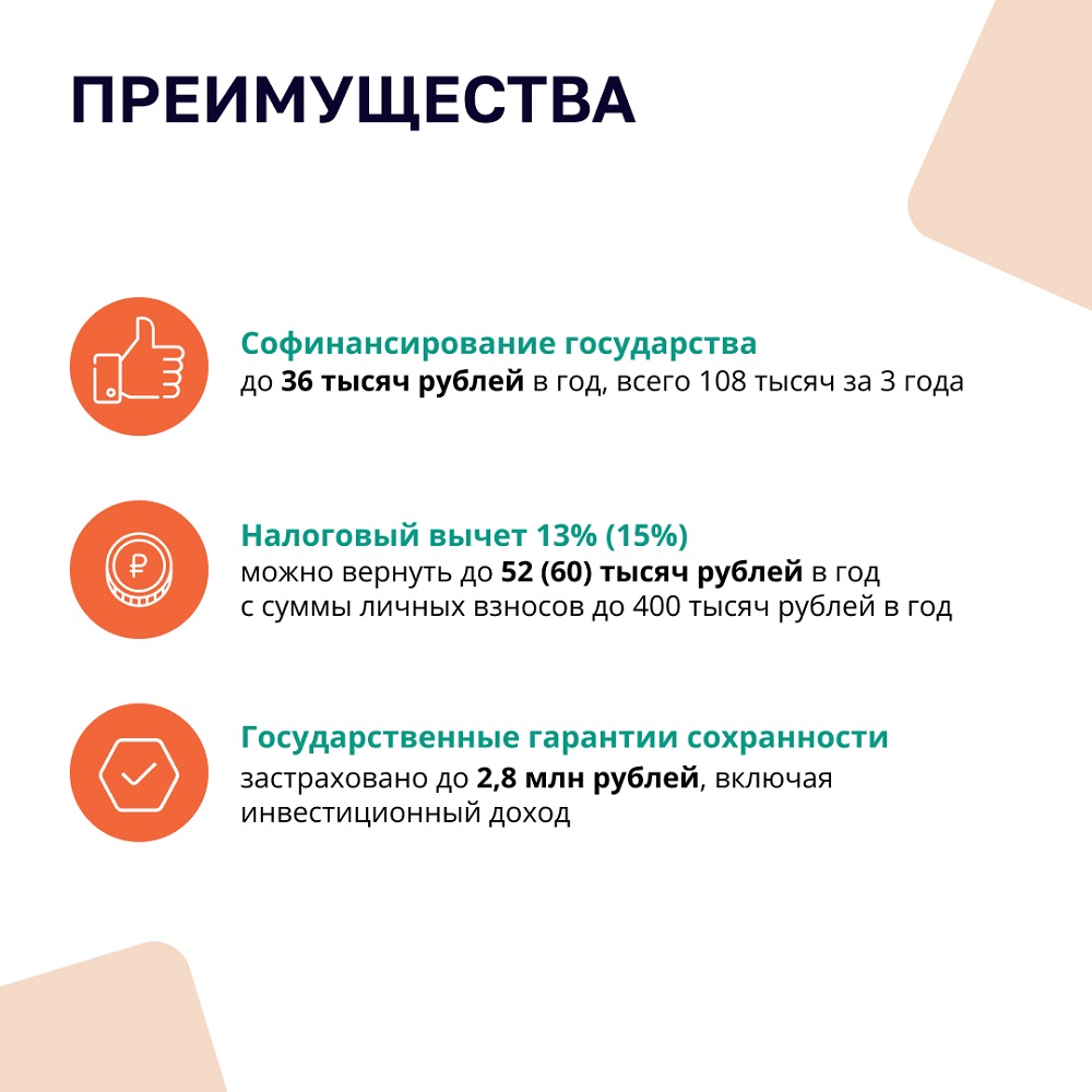 Государство гарантирует сохранность внесенных гражданами средств и дохода от их инвестирования до 2,8 млн рублей, а также переведенных в программу пенсионных накоплений и суммы софинансирования. Сформированные средства граждан по программе наследуются в полном объеме за вычетом выплаченных средств (за исключением случая, если участнику программы назначена пожизненная периодическая выплата). В особых жизненных ситуациях (дорогостоящее лечение или потеря кормильца) гражданин может без потерь получить до 100% сформированных средств.