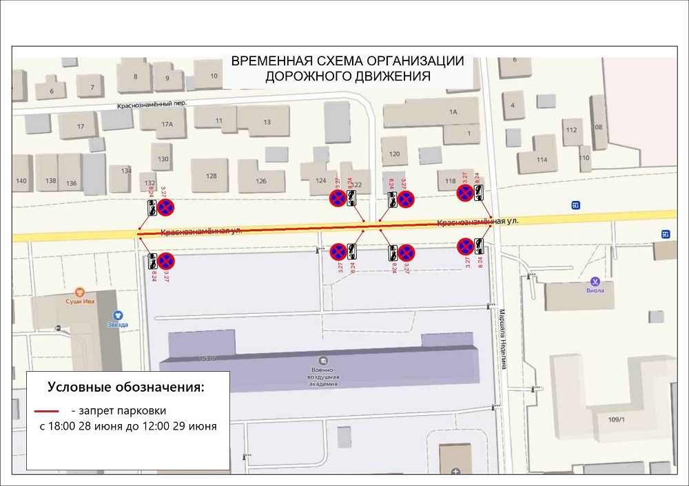 26.06.2024 В связи с проведением торжественной церемонии выпуска офицеров ВУНЦ ВВС «Военно-воздушная академия профессора Н.Е. Жуковского и Ю.А. Гагарина»:- – с 18:00 28 июня до 12:00 29 июня будет запрещена парковка на улице Маршала Неделина (на участке от пересечения с улицей Краснознаменной до дома № 165 по улице Краснознаменной), а также по самой улице Краснознаменной (от дома № 171 до улицы Маршала Неделина);