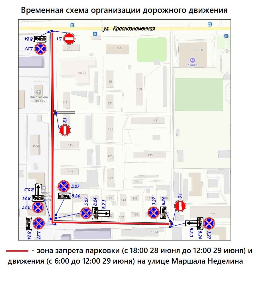 - – 29 июня с 6:00 до 12:00 будет закрыто движение автотранспорта на участке улицы Маршала Неделина – от пересечения с улицей Краснознаменной до дома № 165 по улице Краснознаменной.
