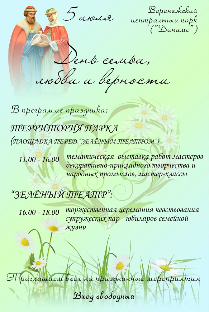 5 июля в «Зеленом театре» на территории Воронежского центрального парка состоится празднование Дня семьи, любви и верности. В программе проведение выставок мастеров прикладного искусства, мастер-классов, а также церемония чествования юбиляров супружеской жизни и концерт.