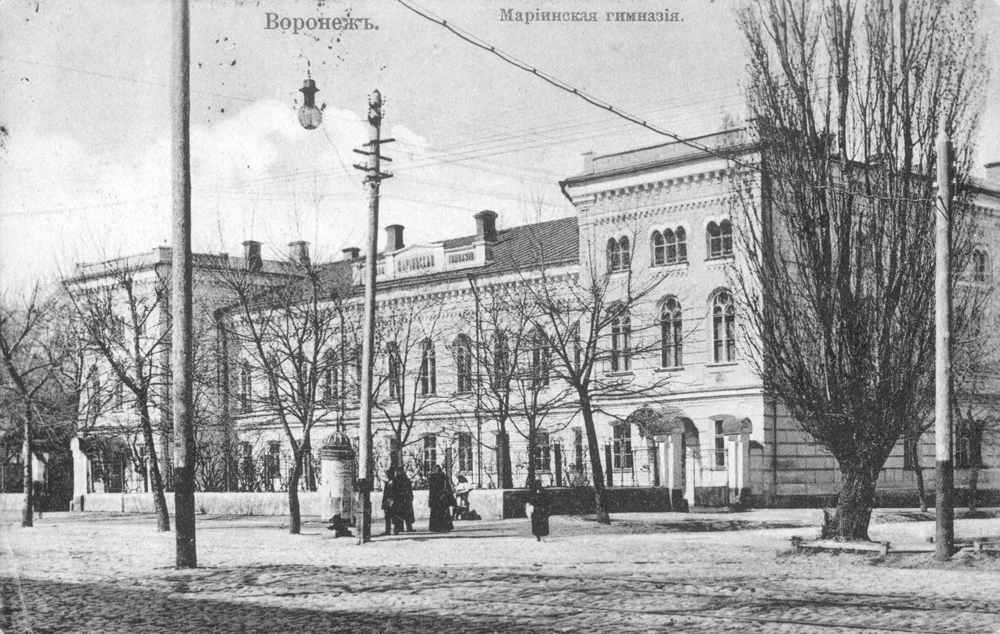 155 лет назад (1861) открылась Мариинская женская гимназия в Воронеже. Первоначально это было женское училище 1-го разряда, преобразованное в Мариинскую женскую гимназию в 1865 г. Гимназия входила в ведомство учреждений императрицы Марии Фёдоровны. В 1875 г. гимназия переехала из наёмного помещения в собственное здание на углу Большой Дворянской и Тулиновской улиц. Как её подготовительное подразделение существовала Николаевская женская прогимназия. Срок обучения был рассчитан на 8 классов, причём последний класс имел педагогическую специализацию. Окончившие его гимназистки получали право на звание домашних учительниц.