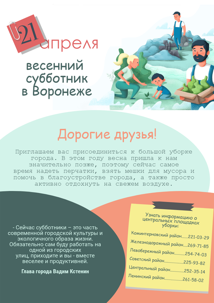 У нас, как обычно, в апреле началась масштабная весенняя уборка города. А 21апреля пройдет общегородской субботник – приглашаю всех воронежцев принять участие!