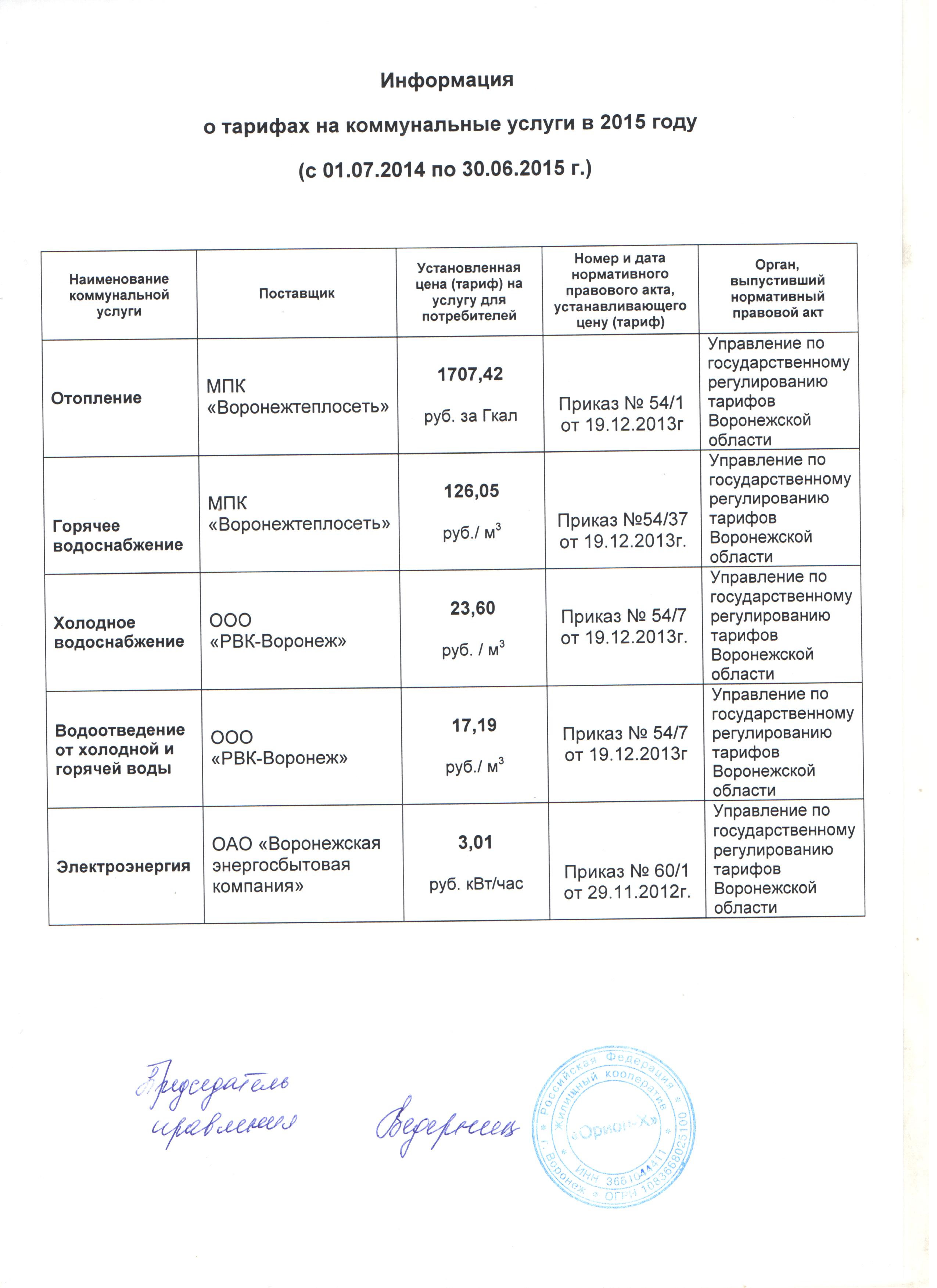 Тарифы на жилищно-коммунальные услуги по состоянию на 01.01.2015 г.:
