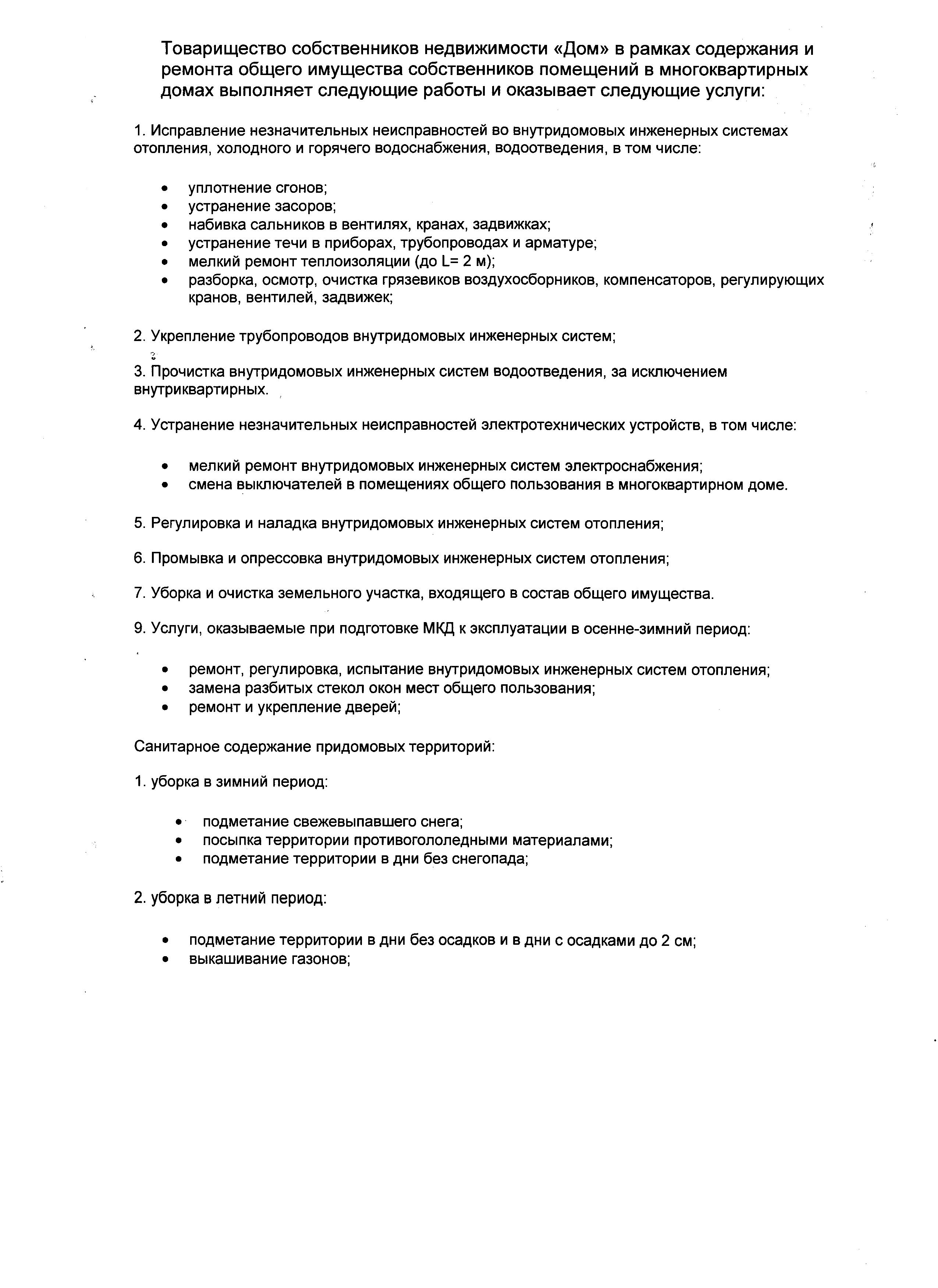 Товарищество собственников недвижимости «Дом» в рамках содержания и ремонта общего имущества собственников помещений в многоквартирных домах выполняет следующие работы и оказывает следующие услуги