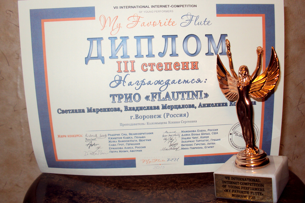 Трио «Флаутини» МБОУДОД Детской школы искусств № 9 городского округа город Воронеж в составе Маренковой Светланы, Мерцаловой Владиславы, Корязиной Анжелики (преподаватель Коломыцева Ксения Сергеевна) стали лауреатами III степени VII международного интернет - конкурса юных музыкантов «Моя любимая флейта» - 2015 и приняли активное участие в мастер-классах ведущих педагогов мира в рамках программы «Большие флейтовые дни» в Москве.