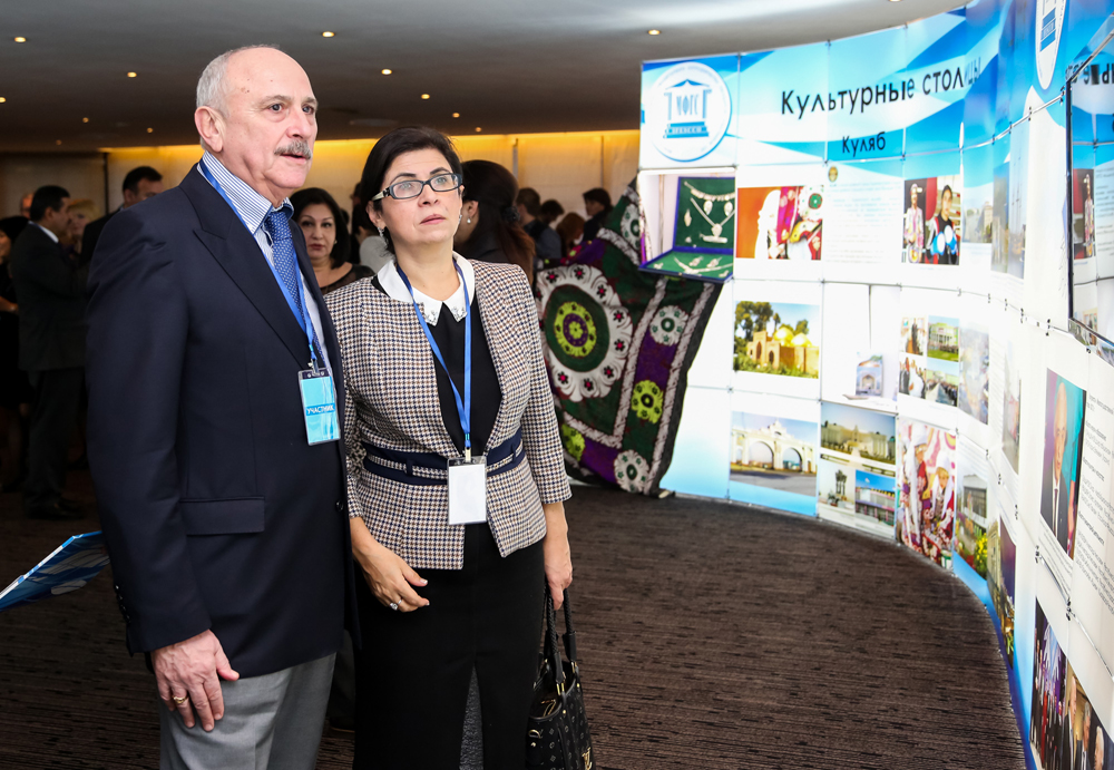 Перед началом мероприятия делегации ознакомились с экспозицией выставки, которая рассказывала о работе форума в прошлые годы, представляла российский Воронеж и таджикский Куляб в качестве культурных столиц СНГ будущего года.