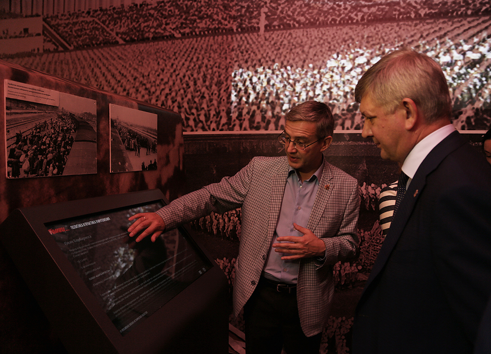 Мероприятие прошло в «Event hall» Сити-парка «Град». Здесь же, на 1 этаже, проходит выставка «Помни… Мир спас советский солдат!». Экспозиция рассказывает об ужасах фашизма и разгроме нацистов советскими войсками. Зрителям представлены 9 тематических композиций, в числе которых – «Приход к власти фашистов», «Массовые репрессии. Концлагерь», «Преступления фашизма против человечества», «Смертельная схватка и цена Победы». Именно со знакомства с данной выставкой и начал свое участие в образовательном форуме Александр Гусев. Экскурсию провел начальник научного отдела Российского военно-исторического общества Юрий Никифоров.