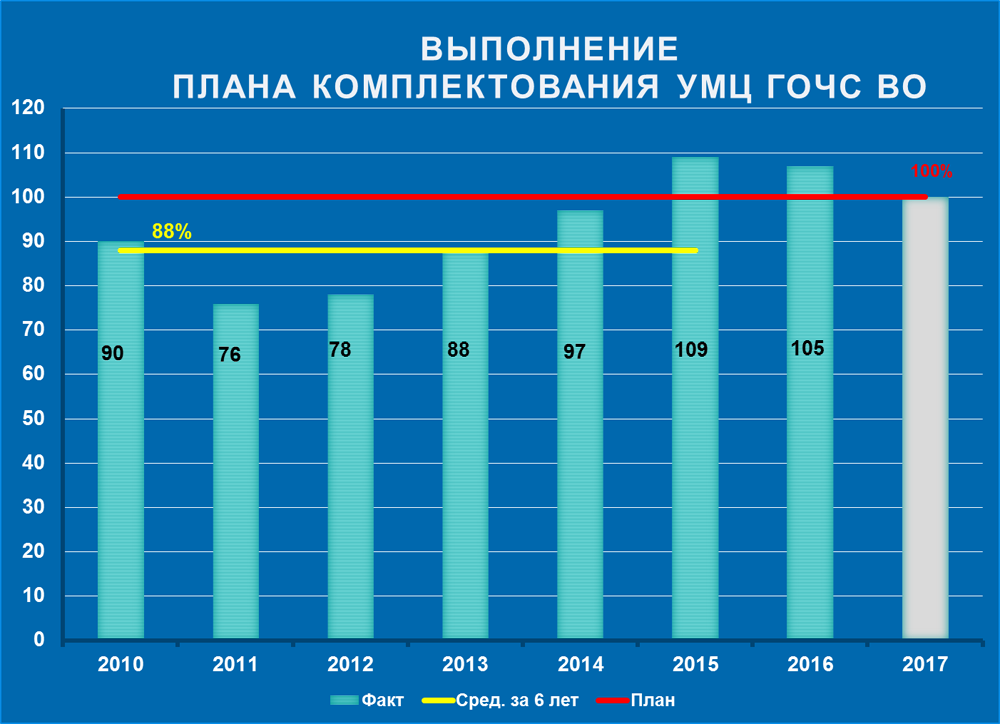 На 2016 учебный год план подготовки слушателей на базе УМЦ ГО ЧС ВО составлял 143 человека. План выполнен на 105%. Прошли обучение 150 человек по категориям: