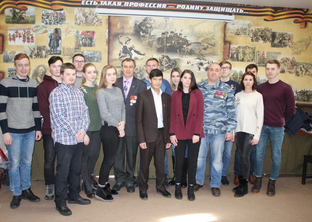 15 февраля 2019 года в День памяти о россиянах, исполнявших служебный долг за пределами Отечества, в помещении общественного музея поискового отряда «Патриот», созданного при ДОСААФ России Воронежской области, Воронежская областная общественная организация ветеранов боевых действий «Патриот» провела урок мужества со студентами ФГБУ УВО «Воронежский государственный технический университет». На мероприятии участник боевых действий в Афганистане А.М. Веревкин рассказал присутствующим о тех далеких событиях и всех трудностях той войны.