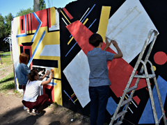 Далее проект Кирилла был воплощен в жизнь на внутренней стороне забора общеобразовательной школы № 14 учащимися 11 «А» и 11 «Б» классов совместно с воспитанниками детской студии довузовской архитектурно - дизайнерской подготовки «СТУПЕНИ» при кафедре Дизайна ВГТУ (руководитель Татьяна Паничева) под непосредственным руководством арт-директора фестиваля Дарьи Ващук.