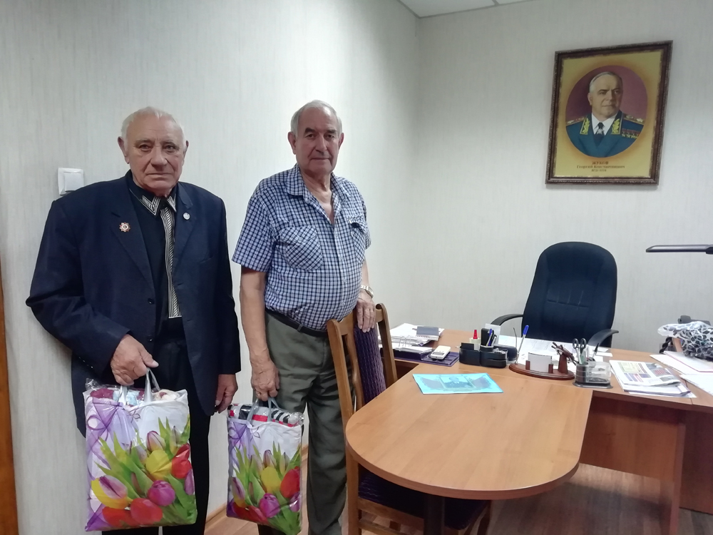 От имени руководителя управы Юрия Бавыкина поздравления и подарки были вручены людям, за плечами которых славный путь служения на благо Отечества и огромный вклад в развитие нашего города и страны – председателю организации Вячеславу Косареву и его заместителю Ивану Аксенову.