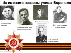 В рамках районных мероприятий, посвященных 433-ей годовщине со дня образования г. Воронежа отделом по работе с молодежью и организации культурно-досуговой и физкультурно-спортивной деятельности управы Советского района был организован и проведен конкурс электронных презентаций «Их именами названы улицы Воронежа».