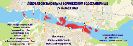 По результатам мониторинга ледовой обстановки сегодня, 27 января, толщина льда на воронежском водохранилище варьируется от 0 до 8 см. Выход на лед сейчас небезопасен!