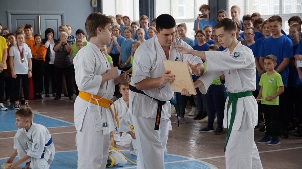 Яркое представление завершилось показательными выступлениями учеников с элементами разбивания досок.