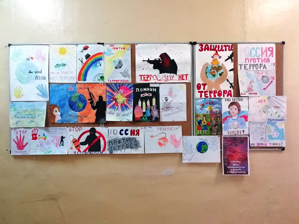 К примеру, учащиеся 13-й школы проводят выставку рисунка «Дети против терроризма».