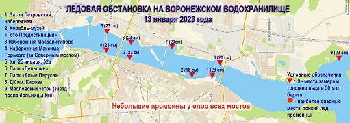 13.01.2023 Городские спасатели отслеживают толщину льда на воронежском водохранилище.В среднем ледовый покров имеет толщину 18-23 см по всей акватории. Наиболее опасные места - у опор мостов, по руслу реки вдоль правого берега и в районе теплоэлектроцентрали.