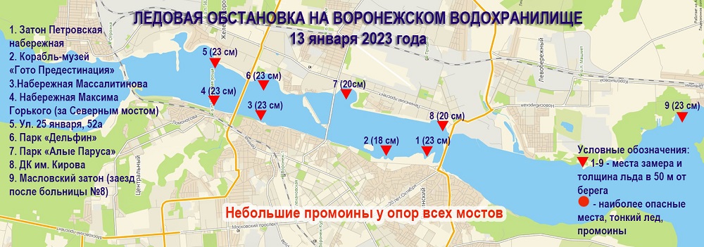 13.01.2023 Городские спасатели отслеживают толщину льда на воронежском водохранилище.В среднем ледовый покров имеет толщину 18-23 см по всей акватории. Наиболее опасные места - у опор мостов, по руслу реки вдоль правого берега и в районе теплоэлектроцентрали.