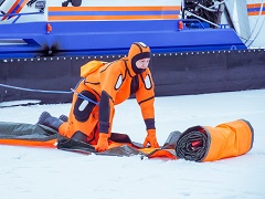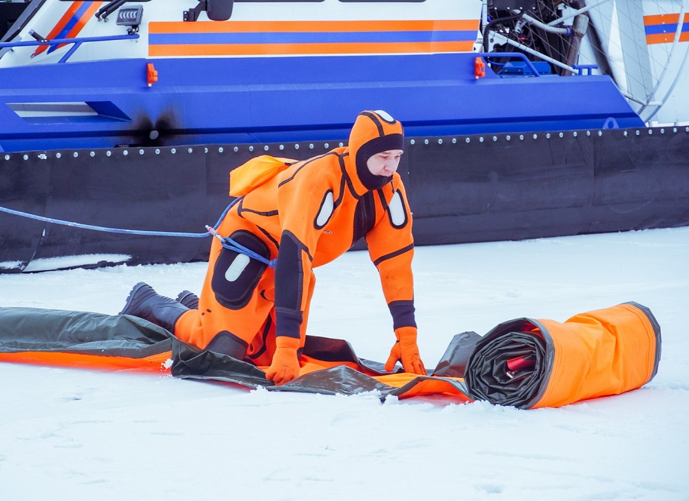 Задача состояла в том, чтобы аккуратно подойти на плавсредстве к месту происшествия и вытащить пострадавшего с помощью различных приспособлений: спасательного круга, конца Александрова или устройства спасения из ледяной полыньи - «УСЛП-10». Это надувная дорожка, которая помогает спасателям подобраться близко к провалившемуся без риска оказаться в ледяной воде.
