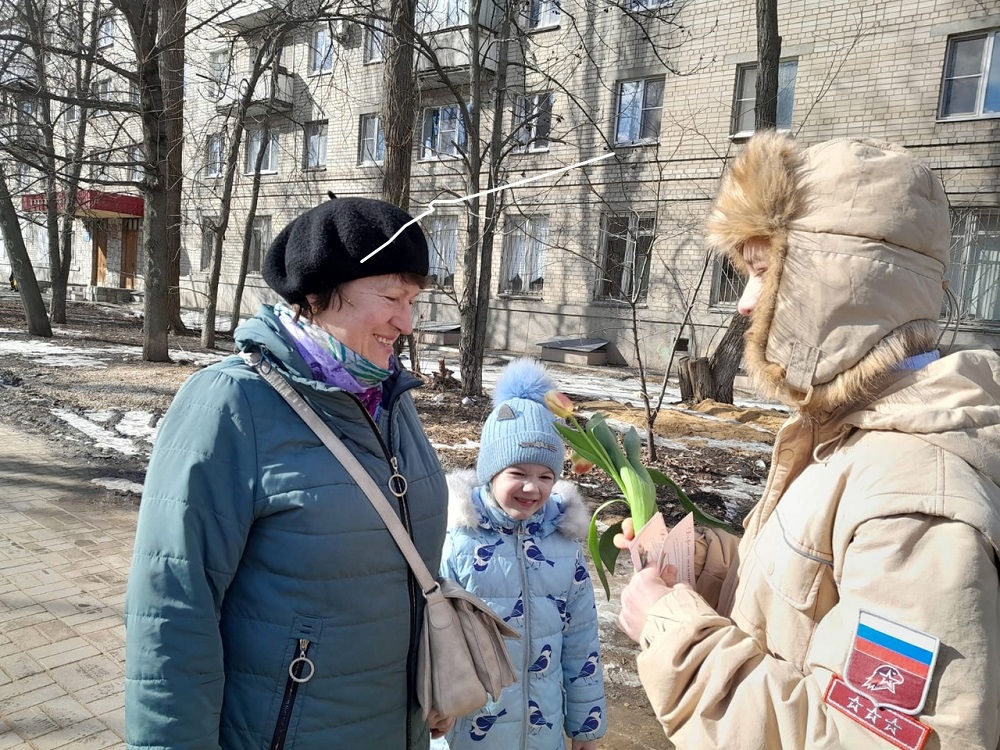 В рамках акции «Километр красоты» на восьми маршрутах вдоль центральных улиц района юнармейцы отрядов «Русичи-19» школы № 19, «Артамоновцы» школы № 36, «Сапсан» школы № 68, «Южный форт» школы № 100, «Патриот» гимназии № 9, «Юные патриоты» и «Вместе» лицея № 9, «Суворовец» (ВКШ им. А.В. Суворова») поздравляли представительниц прекрасного пола и вручали им тюльпаны.