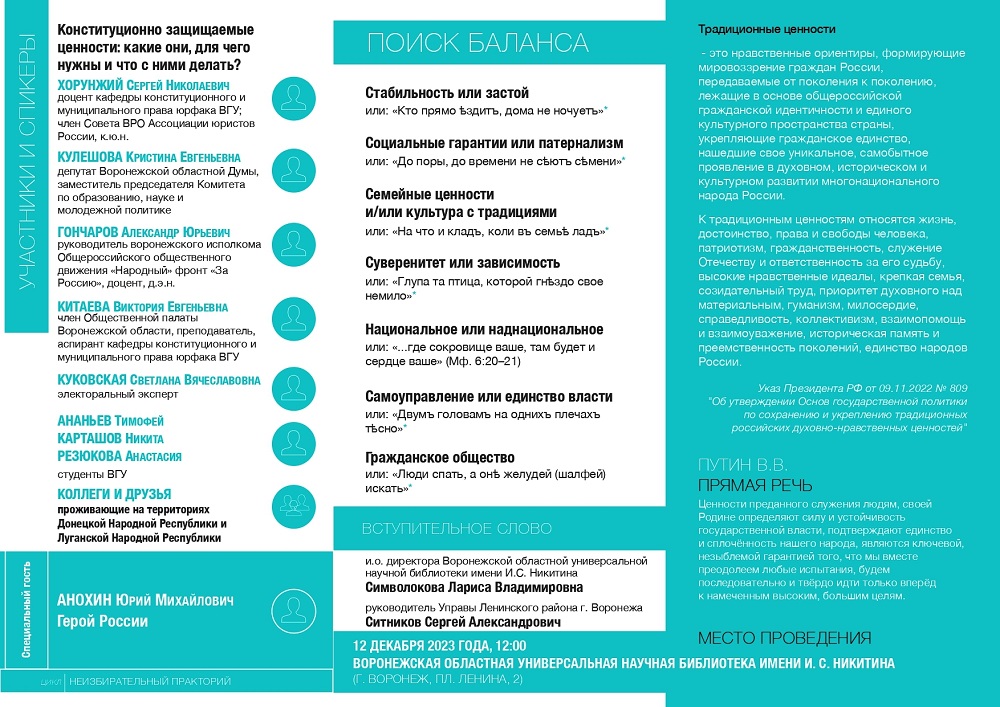 Молодежный научно-студенческий мультидисциплинарный дискурс по традиционным духовно-нравственным ценностям пройдет в день 30-летия Конституции России.Во вторник, 12 декабря, в 12:00 на базе Воронежской областной универсальной научной библиотеки имени И.С. Никитина запланирована дискуссионная площадка с обсуждением наиболее острых вопросов признания и развития современных конституционно защищаемых ценностей России.