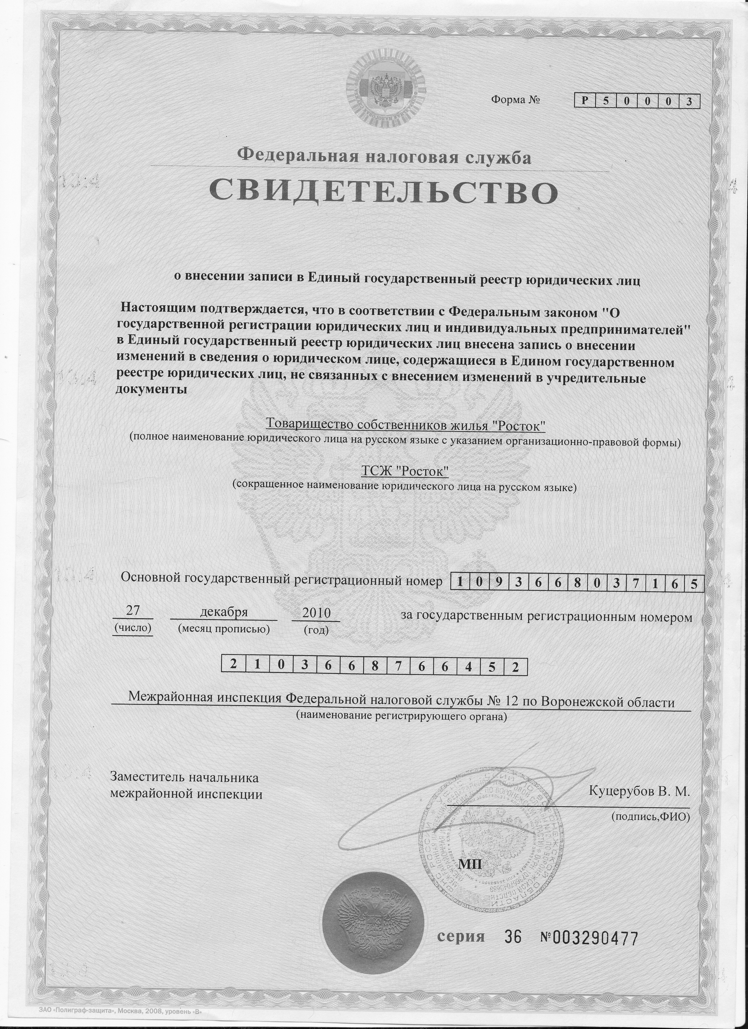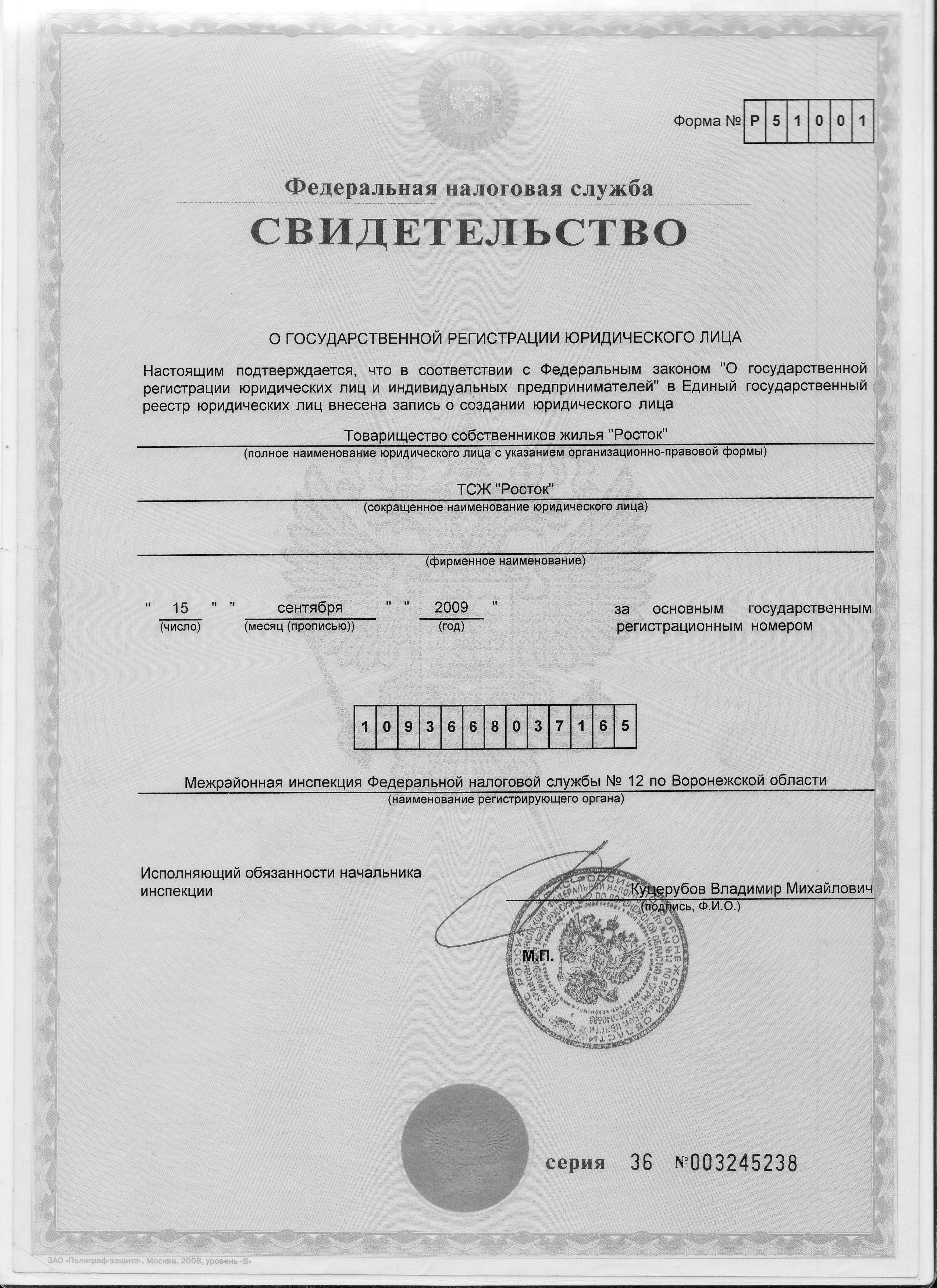 Свидетельство о государственный регистрации юридического лица выдано 15.09.2009 г. Межрайонной инспекцией Федеральной налоговой службы № 12 по Воронежской области за основным государственным регистрационным номером 1093668037165