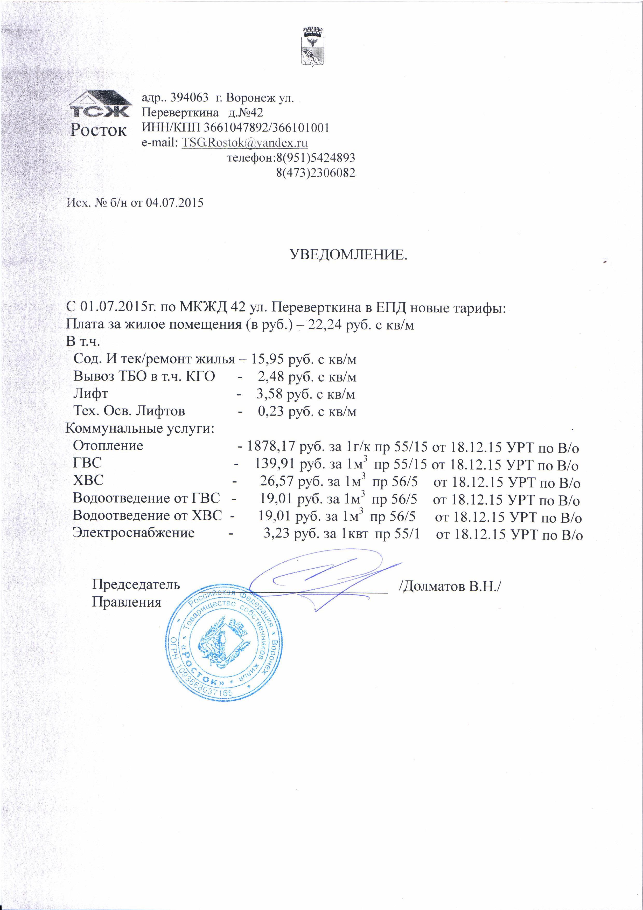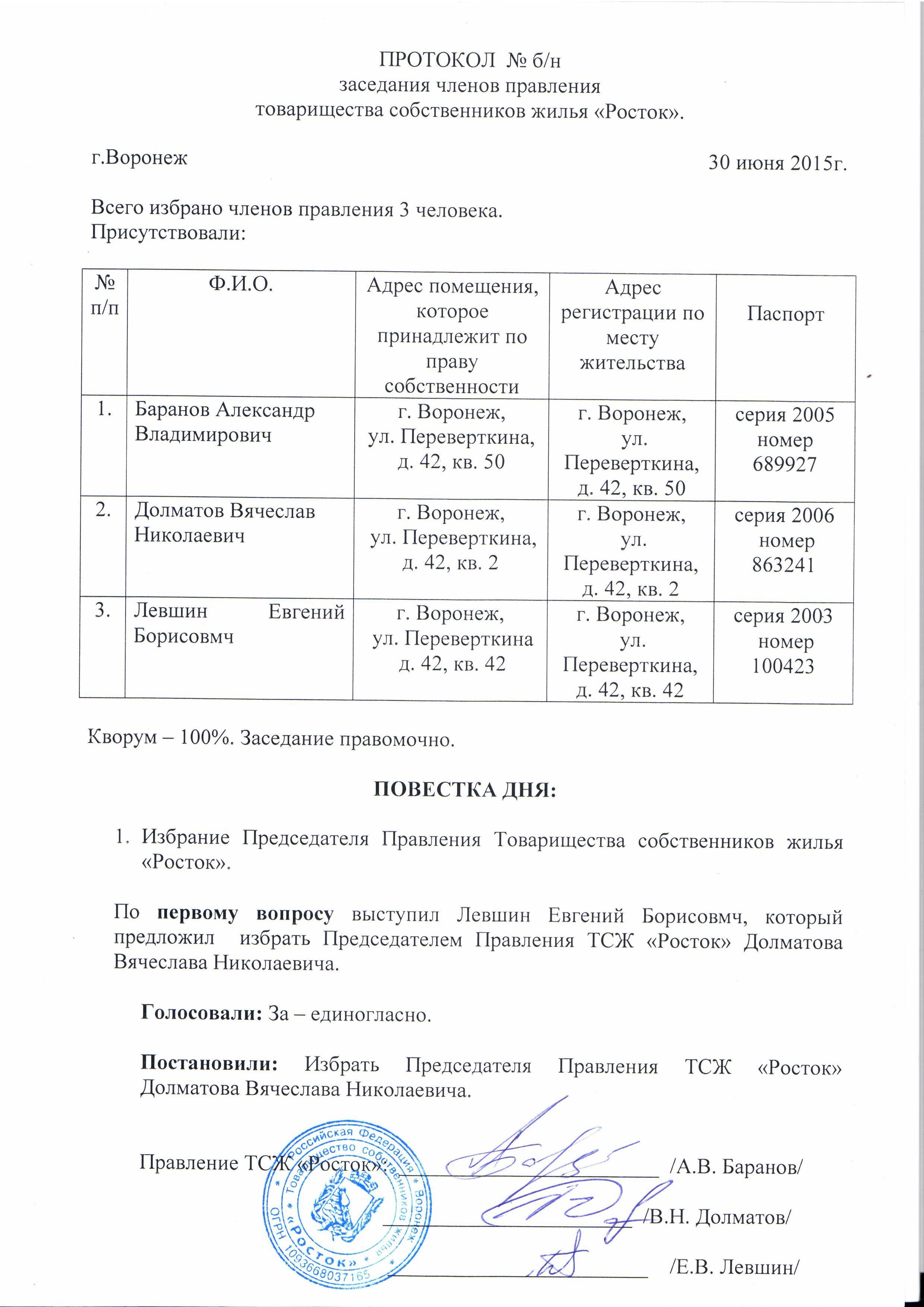 09.04.2012Председатель правления ТСЖ «Росток» - Долматов Вячеслав Николаевич