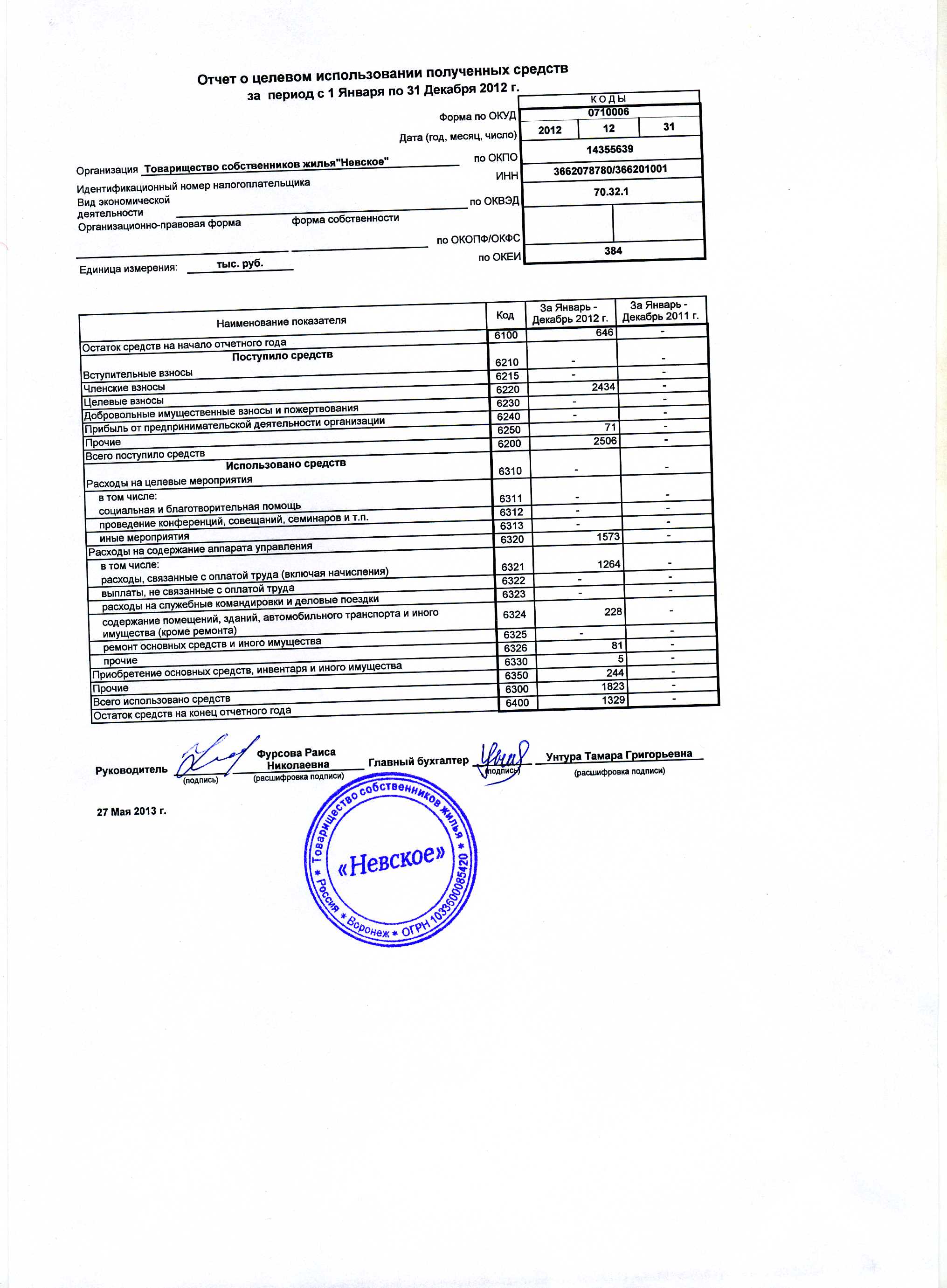 - - Годовой отчёт о деятельности правления ТСЖ "Невское" за 2012 год – на 3-х листах.