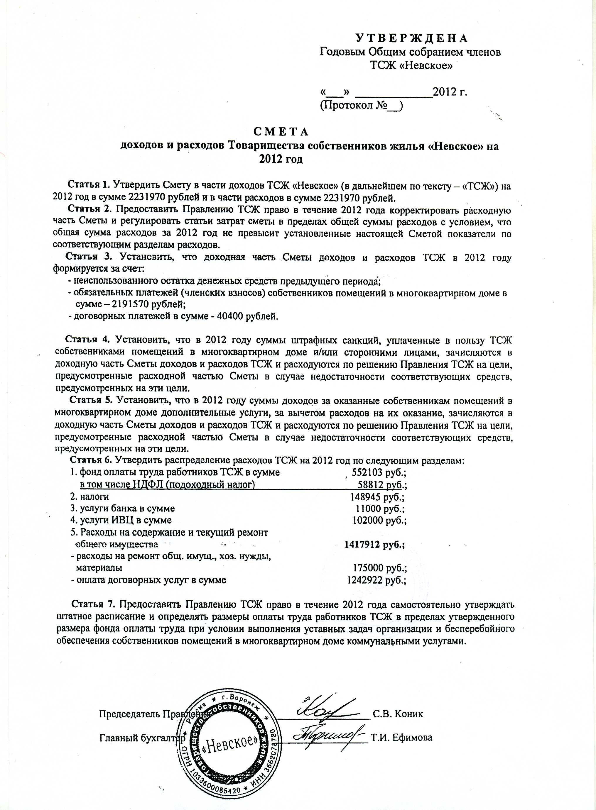 - - Копия сметы доходов и расходов товарищества на 2012 год (размещёна бывшим правлением 21.05.2012 г., оригинал отсутствует, так как бывшим председателем правления не были переданы оригиналы документов финансово-хозяйственной деятельности ТСЖ вновь избранному составу правления (председателю)