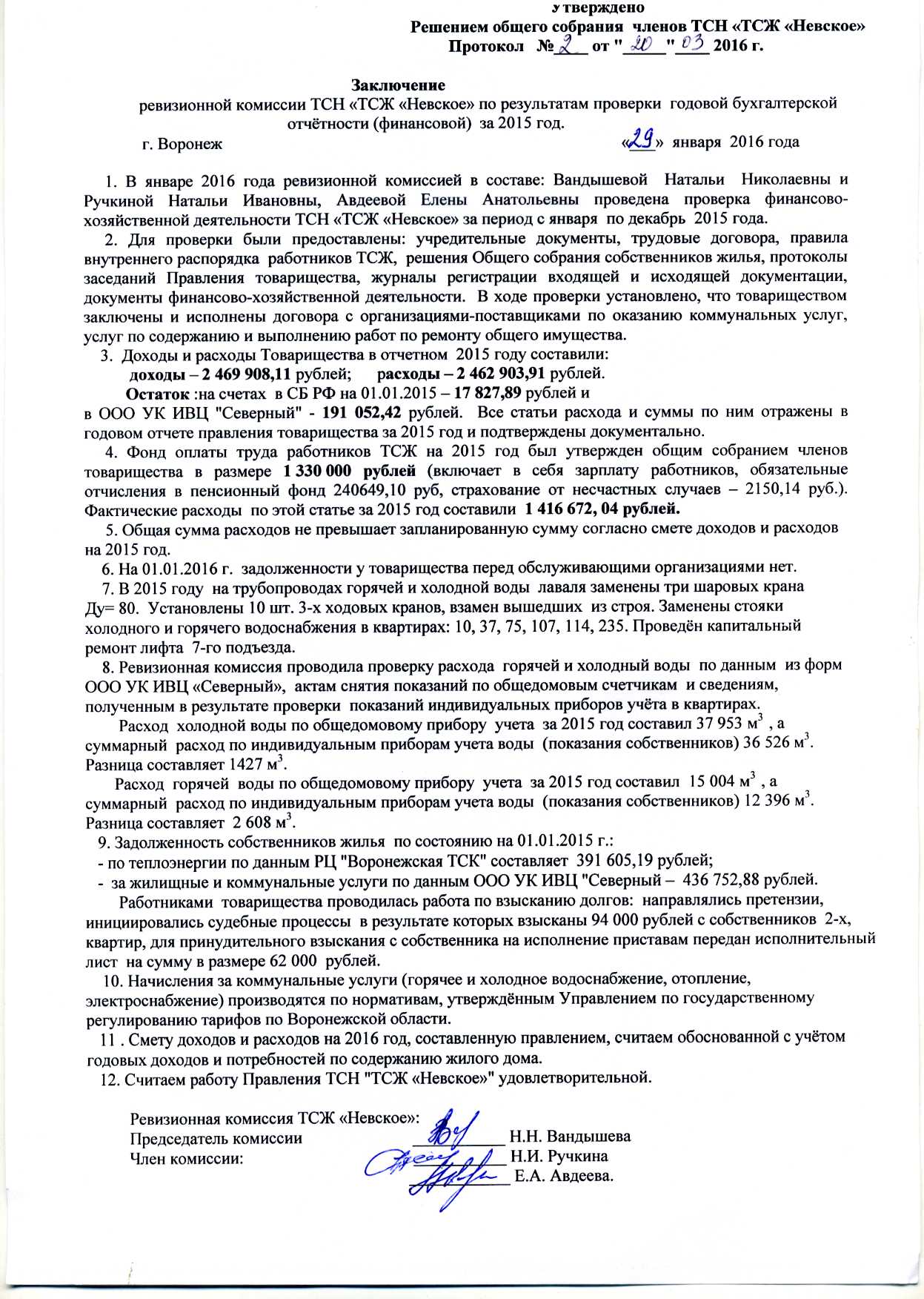 - - Заключение ревизионной комиссии ТСЖ "Невское" по результатам проверки годовой бухгалтерской отчетности (финансовой) за 2015 год.