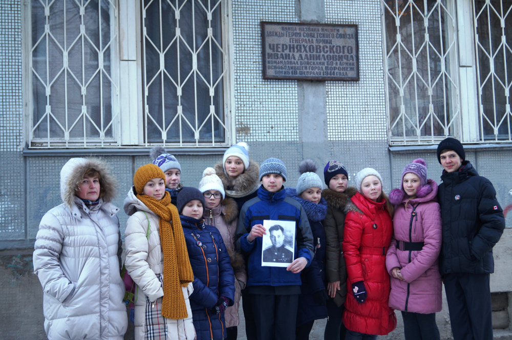 18 февраля 2015 года исполнилось ровно 70 лет со дня гибели дважды Героя Советского Союза Черняховского Ивана Даниловича. В этот день у дома №6 по улице Черняховского, где установлена мемориальная доска в честь героя войны, для учащихся 6 «а» класса школы № 13 прошел историко-культурный урок «Навечно в памяти народной». Его подготовила и провела заместитель директора по воспитательной работе школы Светлана Золототрубова.