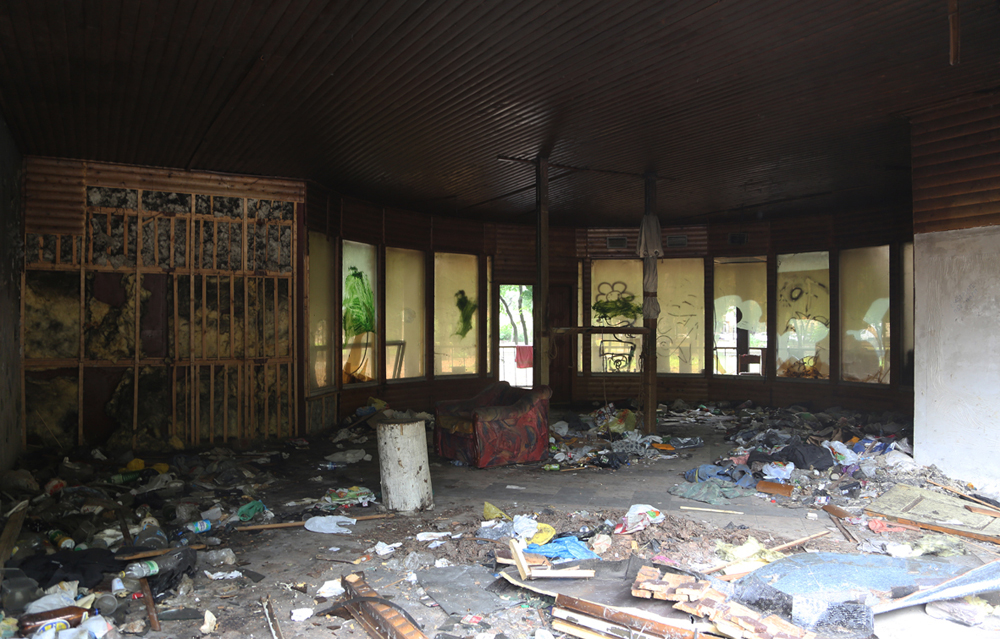 Данное сооружение появилось в зеленой зоне несколько лет назад без разрешительной документации, и недолгое время общепит осуществлял свою деятельность нелегально. Затем заведение закрылось и очень быстро пришло в запустение. Здесь стали собираться маргинальные элементы, бывшее кафе превратилось в общественный туалет. Были даже зафиксированы случаи возгорания сооружения.