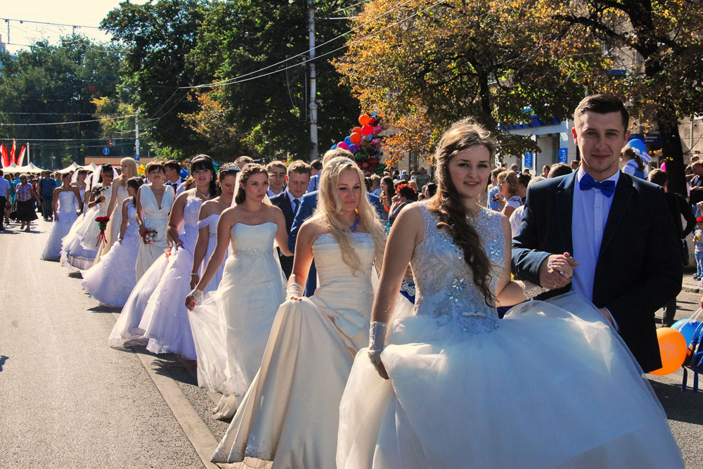 Воронежские молодожены на День города получили поздравления от мэра и прошли парадом