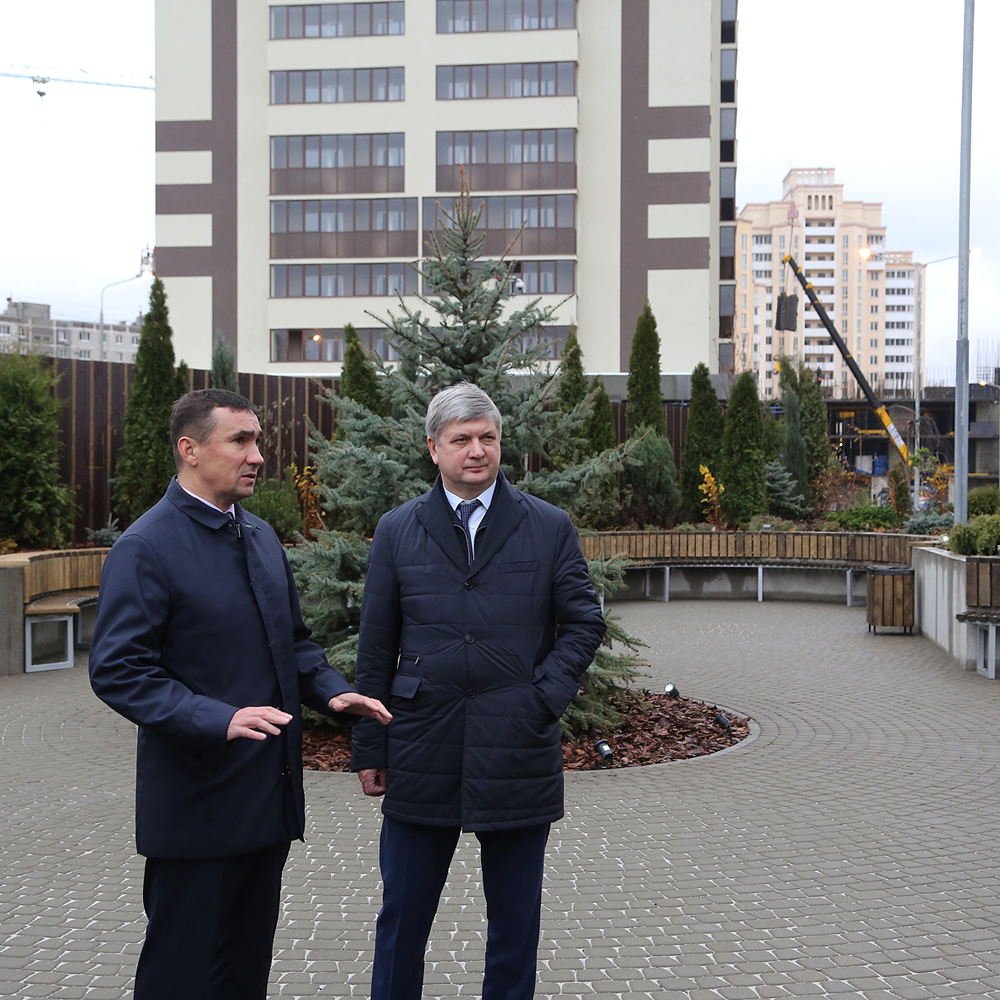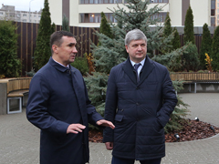 Евгений Хамин проинформировал Александра Викторовича, что благоустройство практически завершено: выложена плитка, разбиты клумбы и цветники, уложен газон, установлены дорожные знаки и нанесена разметка.