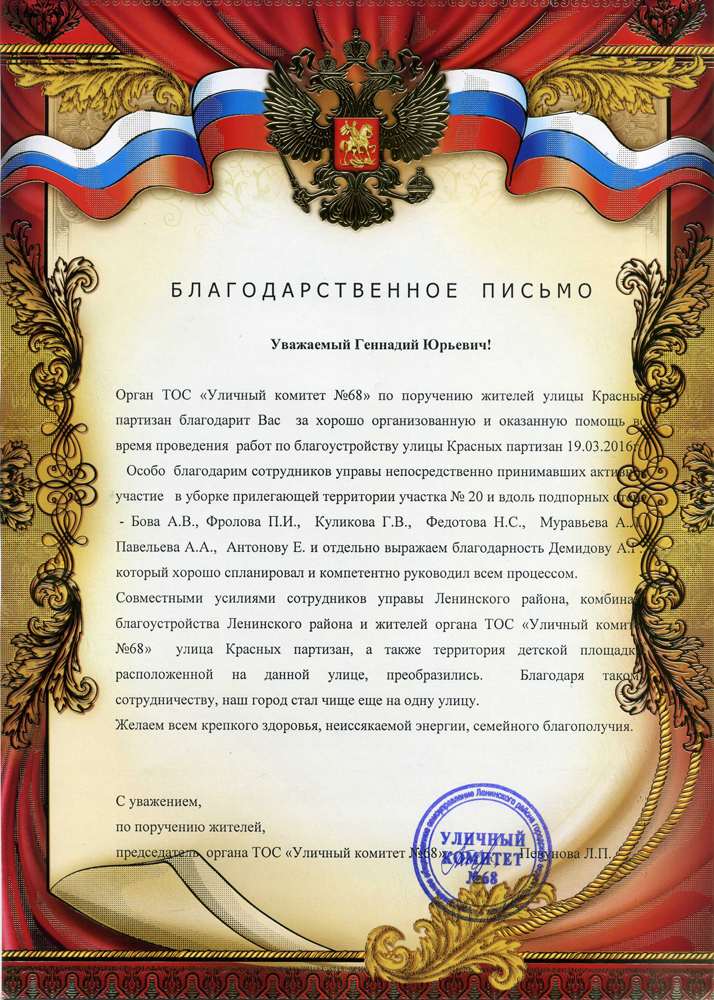 Следует отметить, что личный пример сотрудников управы в наведении порядка в районе находит позитивный отклик у жителей, стимулирует их к практическому участию в санитарных днях и субботниках. Тому пример – недавняя совместная генеральная уборка улицы Красных Партизан. Труд муниципальных служащих отмечен Территориальным органом местного самоуправления.