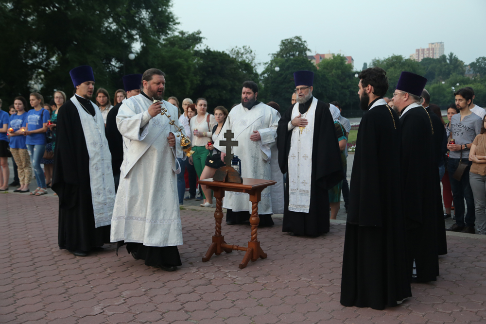 Акция началась с того, что священнослужители провели панихиду в память обо всех погибших на полях сражений. После этого диктор объявил минуту молчания.