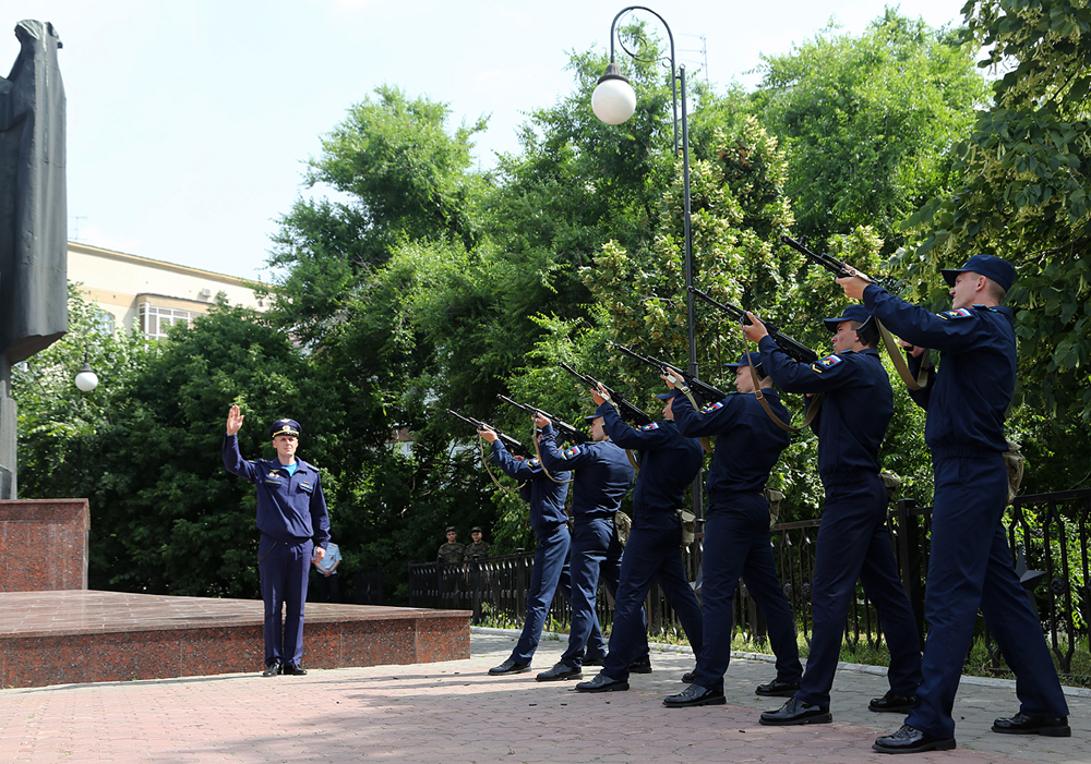 В начале траурного мероприятия курсантов Военно-воздушной академии имени профессора Н.Е. Жуковского и Ю.А. Гагарина поприветствовал начальник учебного заведения генерал-лейтенант Геннадий Зибров.