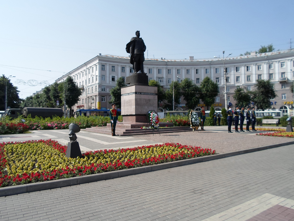 Собравшиеся почтили минутой молчания погибших в годы войны и возложили живые цветы и венки к постаменту генерала Черняховского, а затем подразделение почетного караула произвело оружейный салют, после чего курсанты под звуки военного оркестра промаршировали по площади.