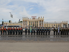 После гимна Российской Федерации и оружейных залпов мимо участников церемонии прошествовала рота почетного караула Военно-воздушной академии имени профессора Н.Е. Жуковского и Ю.А. Гагарина. Курсанты несли российский триколор, флаги Сухопутных войск, Воздушно-космических сил и Военно-морского флота.