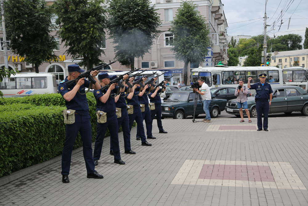 После гимна Российской Федерации и оружейных залпов мимо участников церемонии прошествовала рота почетного караула Военно-воздушной академии имени профессора Н.Е. Жуковского и Ю.А. Гагарина. Курсанты несли российский триколор, флаги Сухопутных войск, Воздушно-космических сил и Военно-морского флота.